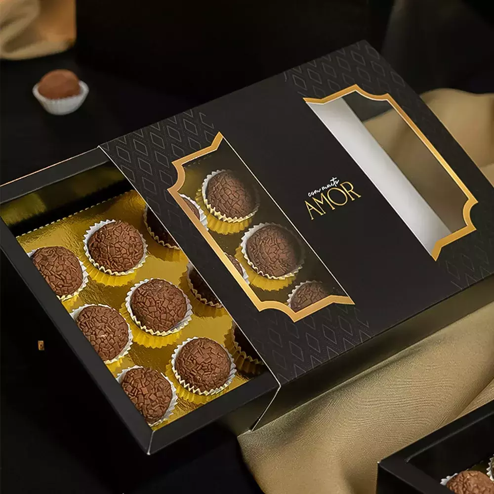 Caixa para 12 doces com berço dourado e visor em acetato.