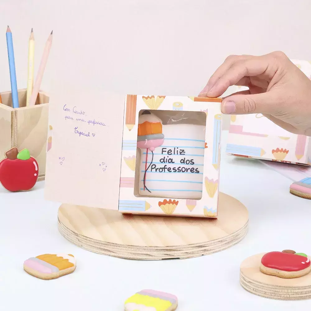 Este cartão foi desenvolvido especialmente para celebrar o Dia dos Professores, transmitindo afeto e reconhecimento de forma única, unindo charme e funcionalidade.